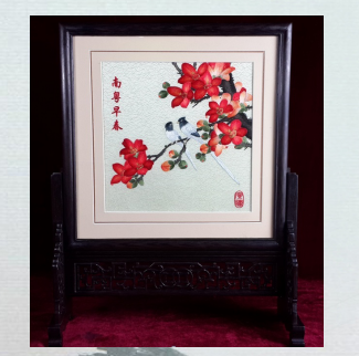 規格:325*325MM 材料:手工刺繡,背面廣繡金箔介紹(雞翅木支架) 工藝說明:亂針滿繡 包裝:禮盒 禮品制作:包裝盒絲印企業logo,背面金箔印制個性化圖案 適合禮品贈送, 家居陳列,個人收藏