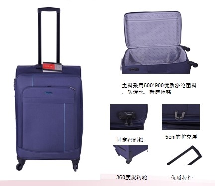 拉桿箱,可托運。主料采用尼龍面料防潑水,耐磨性強。優質的360度旋轉輪,可側拉、平推,大大減輕了您手臂的壓力。優質拉桿收拉自如,箱體自帶固定密碼鎖,使用便捷。箱體有5cm的擴充層,內部空間大,放置更多物品。是您出差旅行的好“伴侶”。友情提示:因此款采用四輪設計,盡可能的平推,既可以使您的旅行箱輪子壽命更久,又可以節省您的臂力。